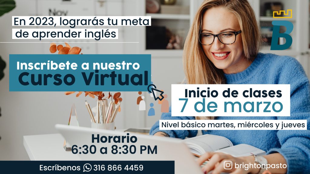 El curso virtual de inglés de Brighton Centro de Inglés comenzará el 7 de marzo de 2023, por lo que ¡no te pierdas la oportunidad de inscribirte y mejorar tu nivel de inglés! Regístrate hoy mismo en el siguiente link o en el numero celular +57 316 866 4459, contáctate con nuestros asesores y comienza tu camino hacia la fluidez en el idioma inglés.